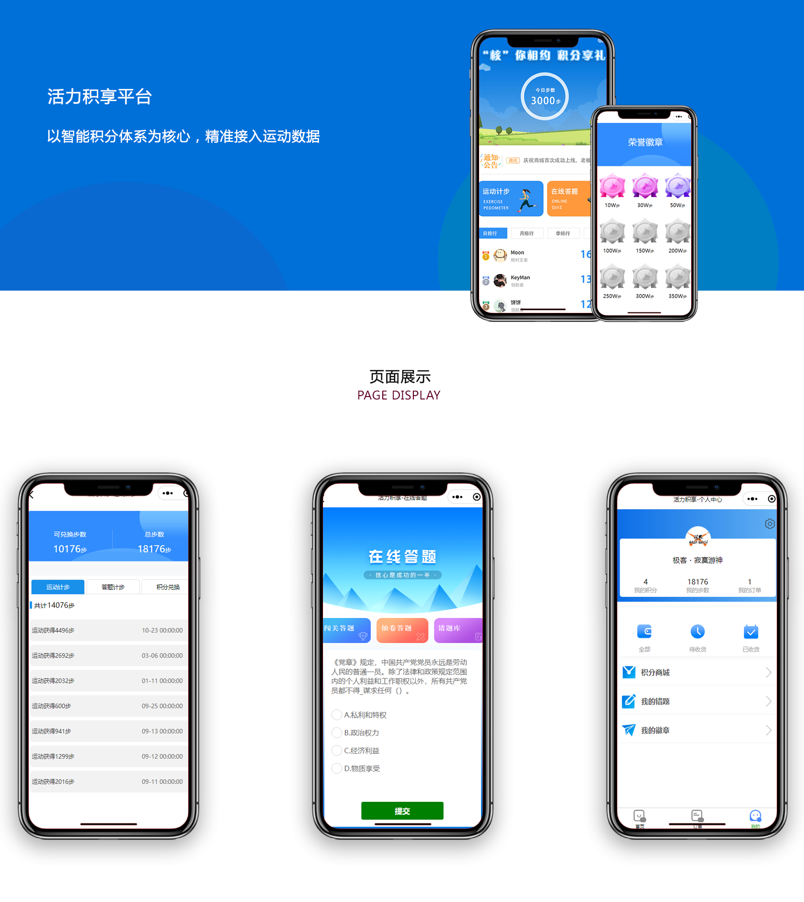 XX集团活力积享平台依托微信小程序即用即走,以智能积分体系为核心,精准接入运动数据,实时统计并转换积分,动态生成多维榜单,达标赠专属徽章,激发全员参与;创新“闯关+抽题”双模式答题,灵活题库与实时反馈,自动归档错题,实现趣味学习与积分双赢;积分可兑多样化礼品,后台自定义规则与商品库,全流程在线审核透明高效;搭配智能管理后台,多端登录一键管控用户、题库、商城及数据,分类统计直观清晰,年度自动重置保障公平,助力企业数字化管理升级!